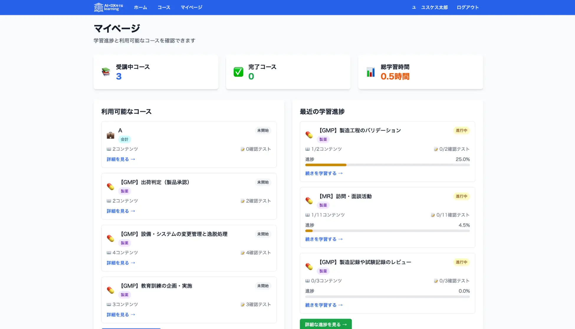 4. 学習進捗の管理機能 受講者のマイページで受講中のコース、修了状況、総学習時間、進捗率を確認可能です。管理者が組織全体の学習進捗を把握する機能も順次実装予定です。